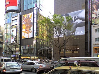 四月上旬の午後五時頃、日没一時間前の銀座通りは高いビルの狭間にあって太陽光の直射は無く一足先に夕暮れの感じです。固定焦点レンズでノーフラッシュ、この内蔵デジカメではかなり厳しい撮影条件。恐らく絞りは開放、スローシャッターだと思われ、この程度の画像品質が精一杯と思われます。