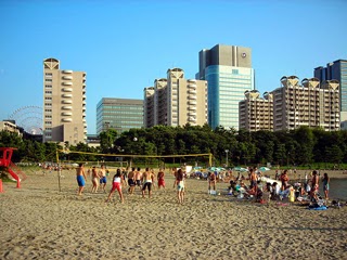 その後ろの砂浜では若者がビーチバレーに興じる姿も見られますが、そばにあるライフガードの赤い見張り台も来週には撤去されこの浜の夏も終わります。また、防波堤に囲まれたこの海面は四季を通じてウインドサーフィンが出来るので、都心にある足の便利さか?いつ行っても海面を滑るように波に乗るサーファーの姿が見られます。