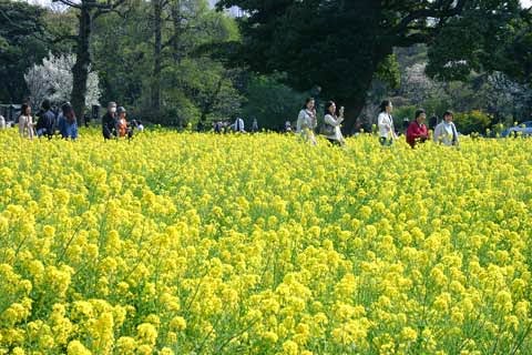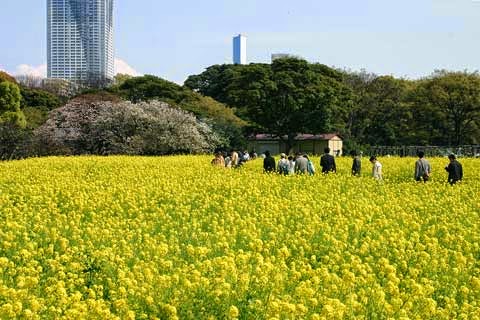 東京都心の菜の花畑。JR新橋駅からそれほど遠くない浜離宮恩賜庭園の一角に今年も時季を忘れず開花、その数は約十万本とか。あたり一面が真っ黄色に染まり、甘い香りにミツバチが群れ飛んでいました。