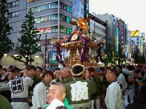 祭りのプログラムは朝早くから始まっていたようですが、私はたまたま夕方にアキバ入りしたのでイベントも終わりに近かく、薄暮の雰囲気が漂う、明神下通りと秋葉原中央通りの交差するあたりで大型の神輿に遭遇しました。